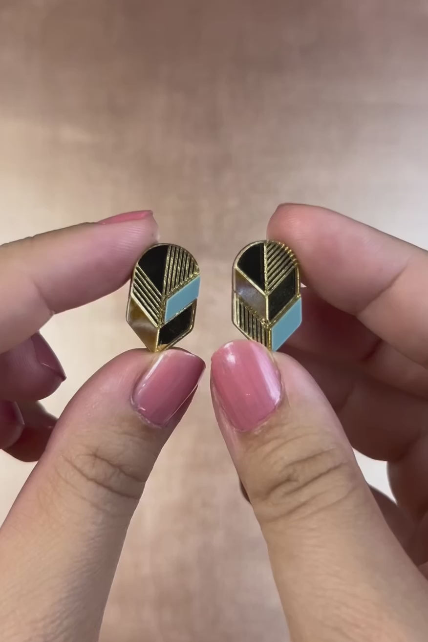 A pair of geometric Leaf Studs in gold, silver, and teal rest on a textured white branch against a light brown background—perfect for lovers of minimalist jewelry.
