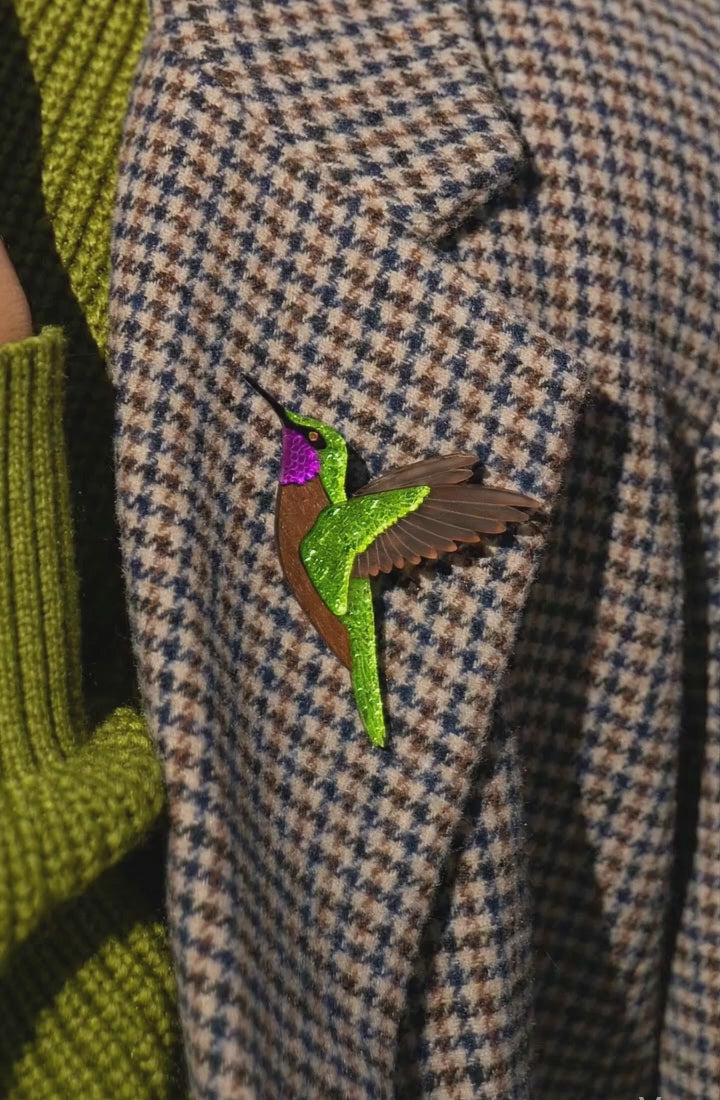 A close-up of a handcrafted hummingbird brooch, made from premium materials, pinned to a houndstooth-patterned coat with a green turtleneck sweater visible underneath.