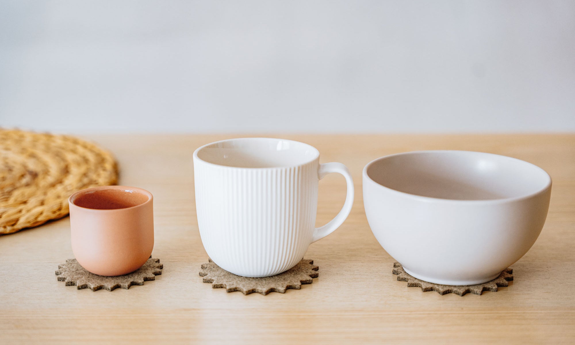 A white mug and a pink cup sit on spiky felt coasters shaped like a hedgehog, adding playful home decor flair to a light wooden table with a woven placemat in the background.