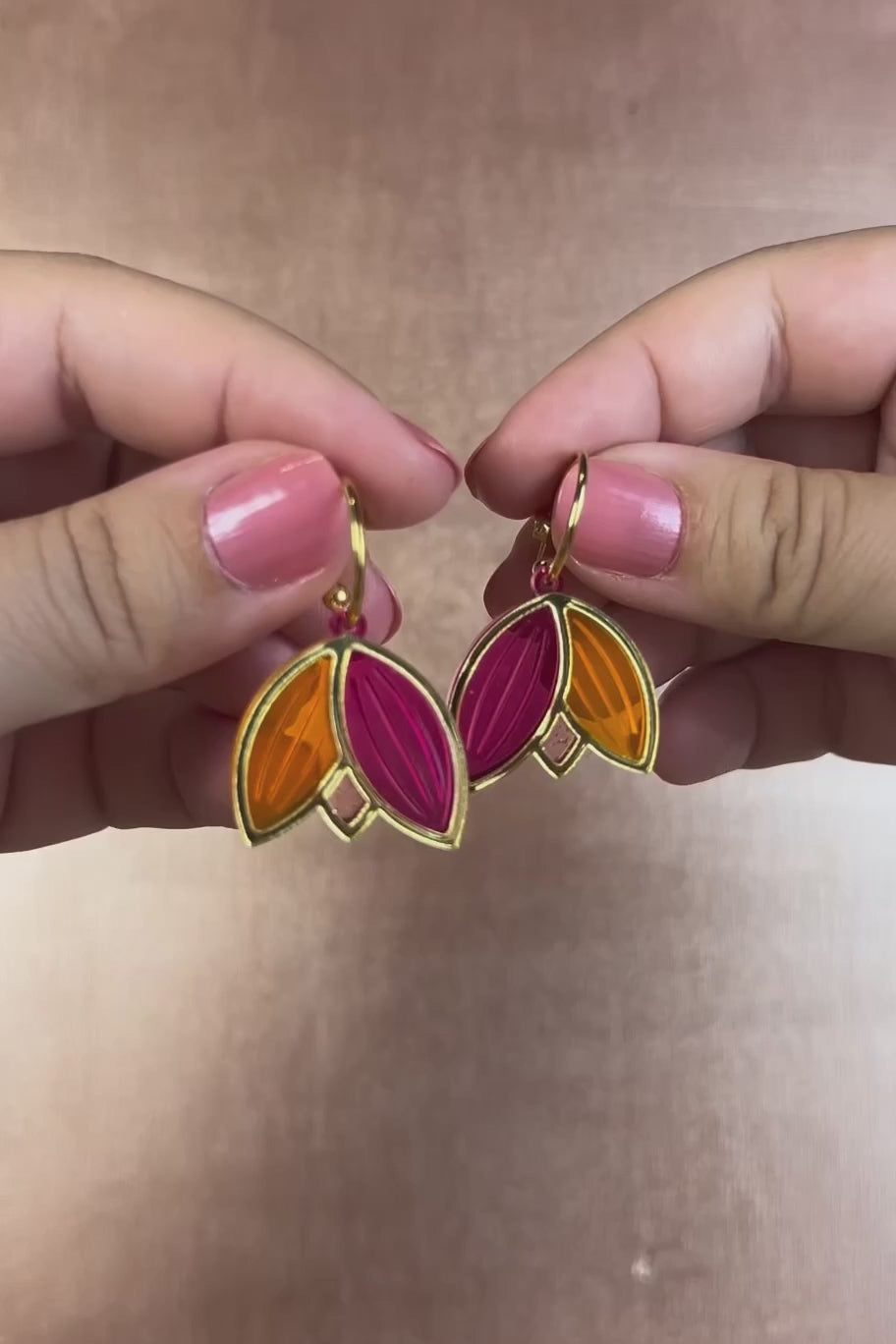 A pair of Tulip Huggie Earrings with artisan craftsmanship, featuring three leaf-shaped charms in vibrant colors—translucent pink and orange outlined in gold—displayed on a white surface.