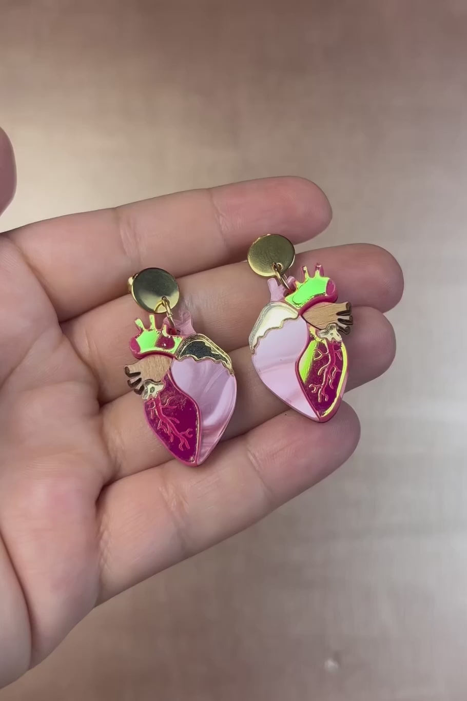 Anatomical Heart Earrings crafted from wood and pink marbled acrylic, accented with gold-tone metal in a bold style, are displayed on a white fabric background.