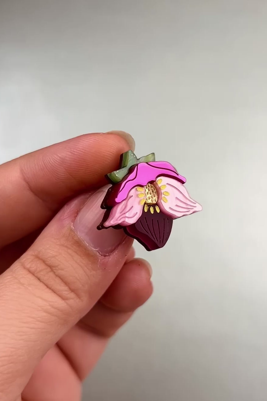 Dodajte svojmu štýlu nádych prírody s pinom s fialovým kvetom čemerice, vyrobeným zo žiarivého akrylového skla a prepracovaných detailov.