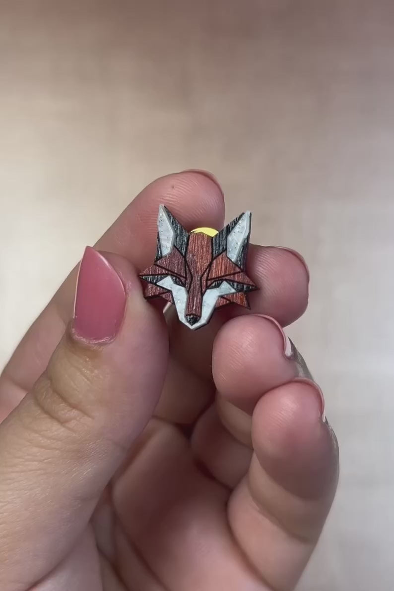 Ohromujúci ručne vyrobený geometrický pin s líškou, vyrobený z prémiového recyklovaného dreva a akrylového skla, ponúka nadčasovú eleganciu pre milovníkov ekologického štýlu.